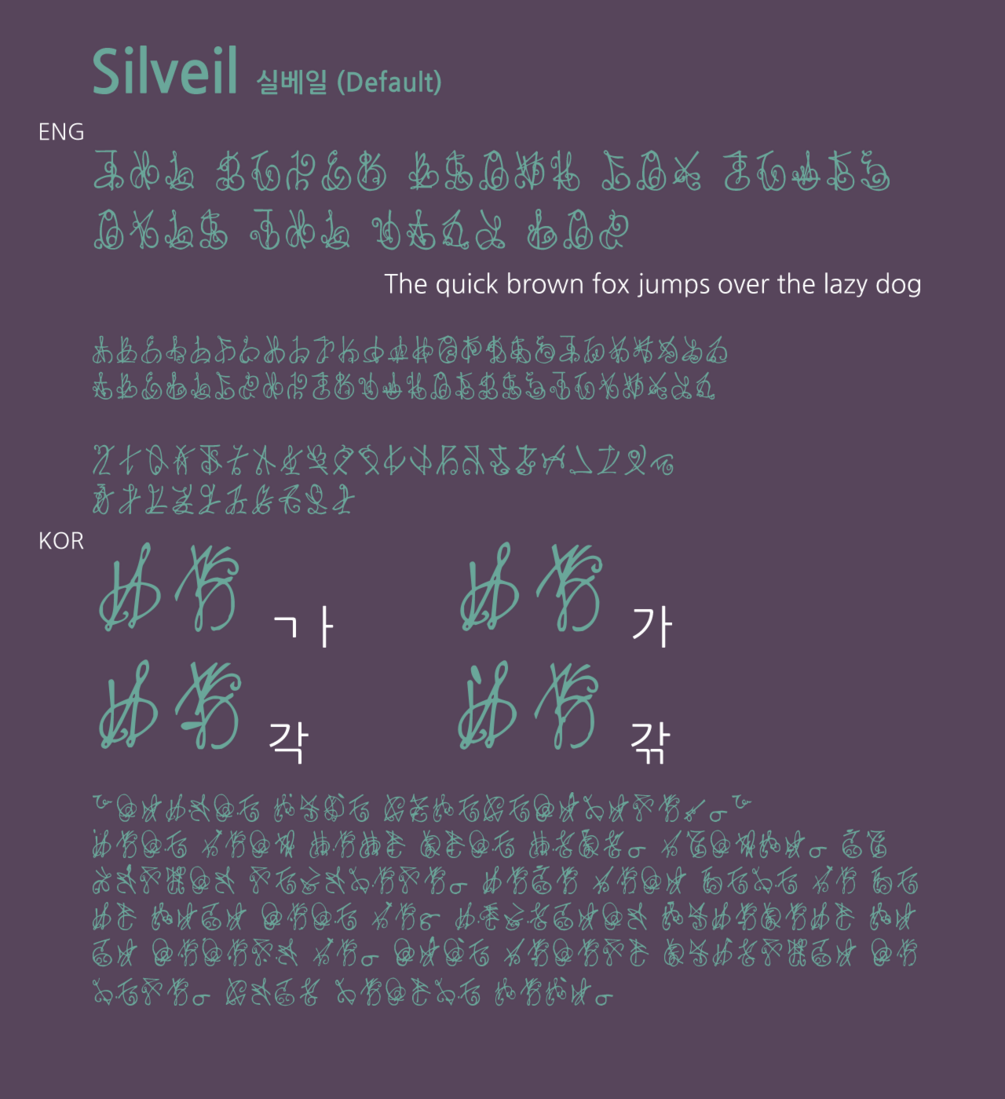 실베일은 곡선 느낌이 강한 장식적 문자로, 가상의 문자나 암호로 사용이 가능합니다.